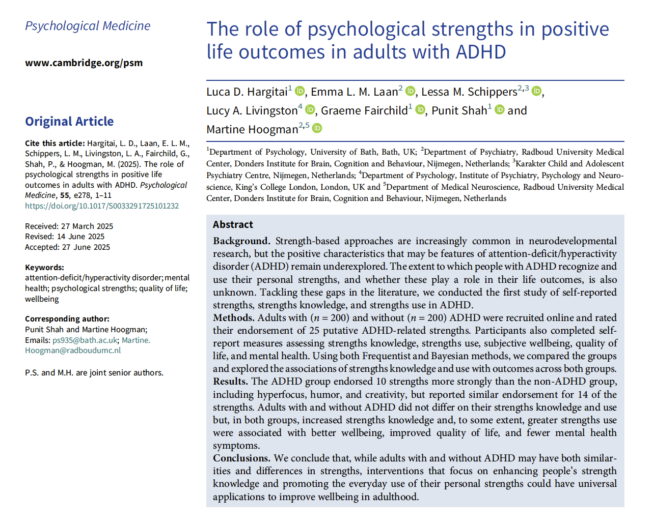 It wasn’t just having strengths. It was strengths knowledge and strengths use—knowing what you’re good at and being able to deploy it in daily life. Across both ADHD and non-ADHD groups, greater strengths use was associated with better wellbeing, better quality of life, and fewer mental health symptoms.